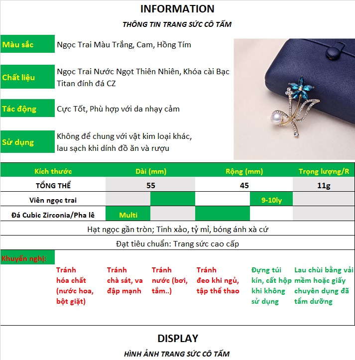 Chất liệu: Ngọc Trai Nuôi Tự Nhiên, Đá CZ Đế gắn ngọc: Kiểu mai vạn phúc 5 cánh xanh  nạm đá, pha lê xanh hợp kim bạc titan mạ vàng Kích cỡ: Ngọc trai bán cầu 9-10ly, Đá cz 1.2ly Kích thước: 55x45mm Thiết kế: Sắc sảo, Tinh tế, Tỷ mỷ, Thời trang, Sang trọng. Thích hợp cho buổi tiệc, Gặp mặt, Làm Quà tặng 8/3 và 20/10 Bảo hành: Bảo hành vĩnh viễn ngọc trai, 12 tháng với sản phẩm