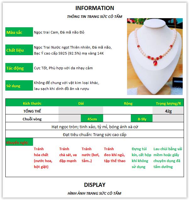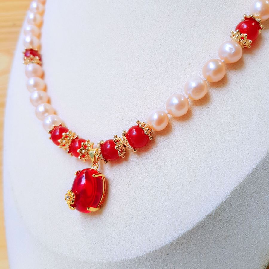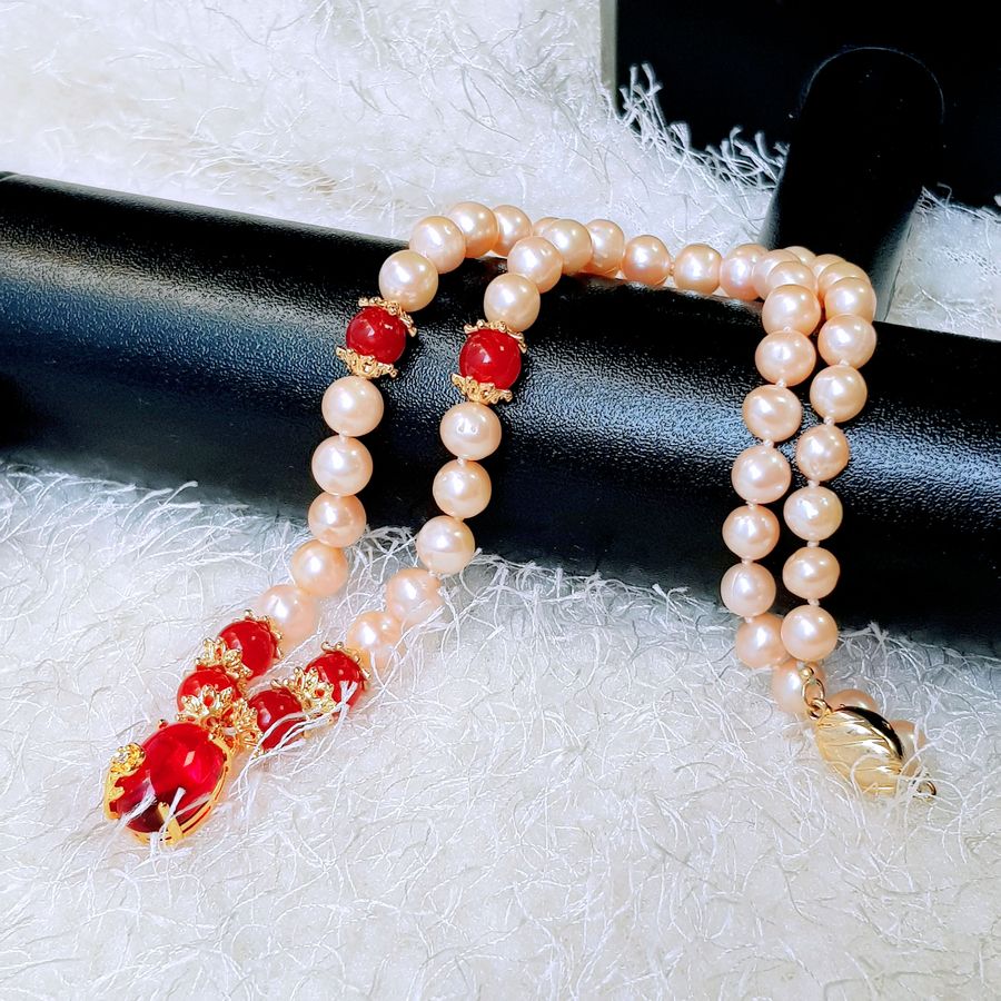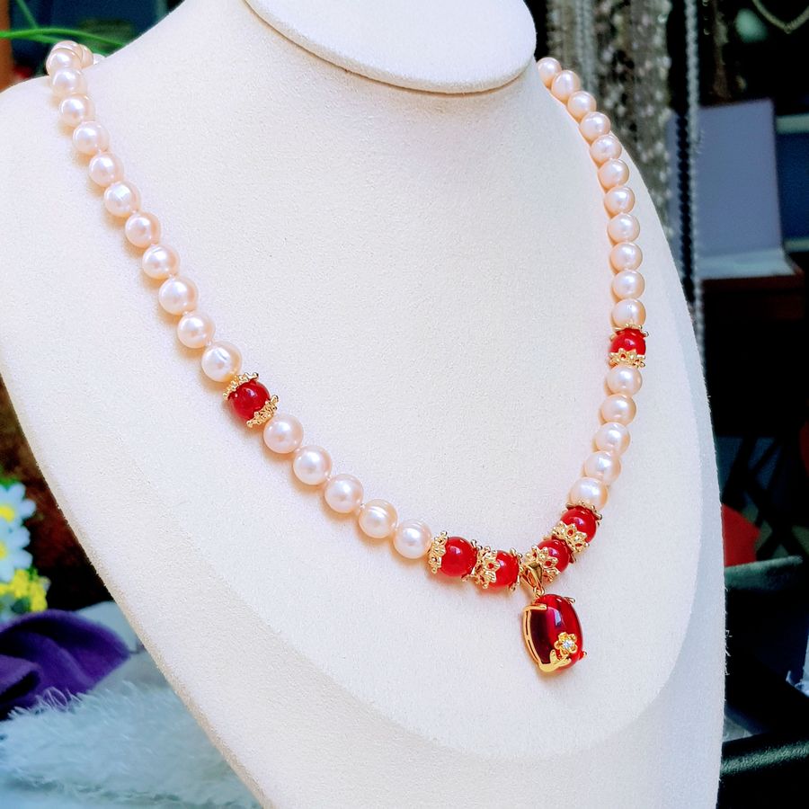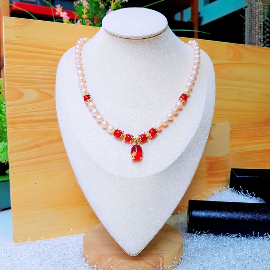 Chất liệu: Ngọc trai nước ngọt Thiên nhiên, Khóa Bạc Ý S925 (92.5%), Đá mã não |
